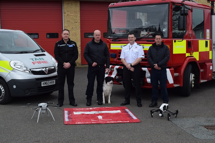 Dyfed Powys Police has teamed up with Mid and West Wales Fire and Rescue Service to use their existing UAVs as part of an agreement. Dyfed-Powys Police Sergeant Chris Neve said: “Mid and West Wales Fire Service are assisting us with Air Support, in addition to the support we receive from the National Police Air Service (NPAS), by allowing us to use their specialist drone when required. “We have used the drone on a number of occasions to assist in searches for vulnerable missing people, as part of road traffic collision investigations, river rescues and more. “This is a great example of collaborative working in a time where emergency services have experienced budget cuts over recent years. It is up to us to work together and work smarter to make sure we’re providing the best possible emergency services to the public we serve.” Station Manager Sean Lloyd said, “The UAV Drones have been used by Mid and West Wales Fire and Rescue Service since October 2015. We use them operationally at incidents that range from wildfires, large scale fires, fires in roofs and chemical incidents. We also utilise the UAV Drones when working with the police during rescues from water and at height and searches for missing persons. “We work in partnership with Dyfed-Powys Police across a broad range of activities and sharing our assets in this way, during emergency situations, allows both the police and fire and rescue service to share intelligence and stream line our efforts to effectively protect our communities.” Photo: (Left to right) Sergeant Chris Neve, Watch Manager Arwel Hughes, Cymro (the urban search and rescue dog), Station Manager Sean Lloyd and Watch Manager Kevin Morgan.